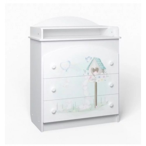 Пеленальный комод Полянка имеет красивый дизайн, рисунок на фасаде и три объемных ящика на шариковых направляющих.