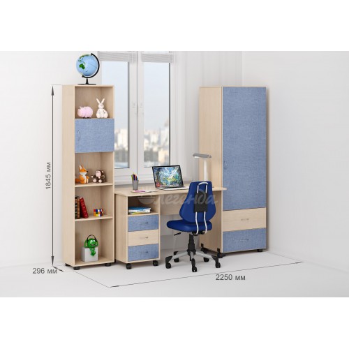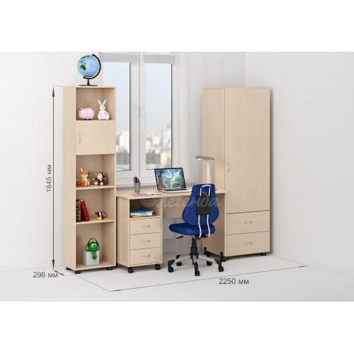 Уголок школьника Л-5, специально разработанный для комнаты с окном. Уголок обрамляет окно: пенал и стеллаж удобно располагаются с двух сторон, а стол находится под окном – тем самым, естественное освещение будет дополнять свет от лампы.