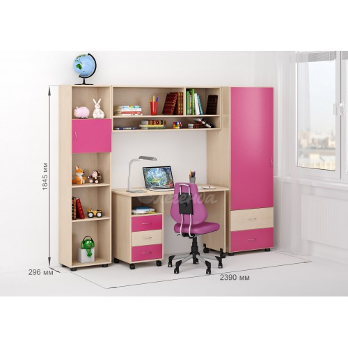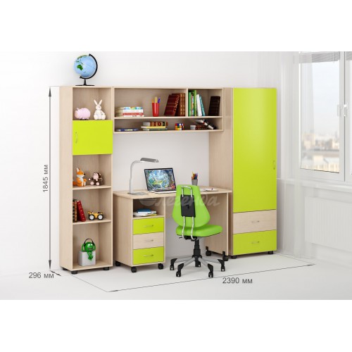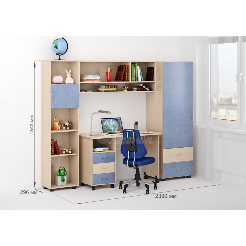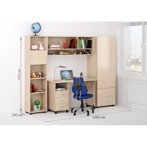 Уголок школьника, в котором стол, стеллаж, пенал и антресоль настолько гармонируют друг с другом, что смотрятся единым целым. Огромное количество мест для хранения учебных принадлежностей, а над столом свободное пространство, в котором легко расположится, например, компьютер.
