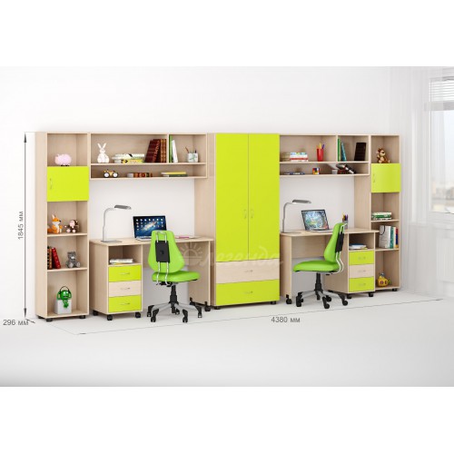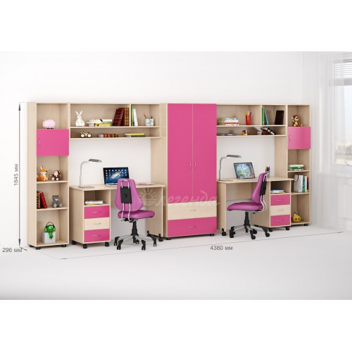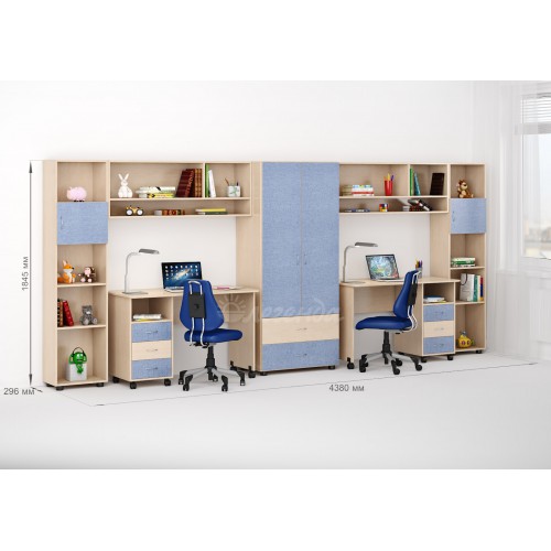 Замечательный вариант для семьи, в которой сразу два школьника.  У каждого будет свой стол, свой стеллаж и своя антресоль. Территории ребят разделяет его величество шкаф – общий на двоих, но большой и вместительный.