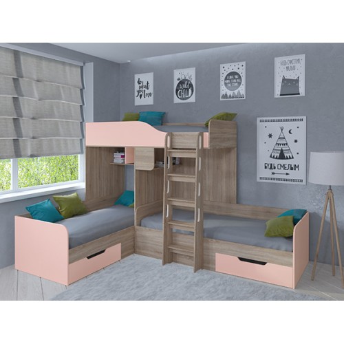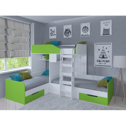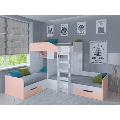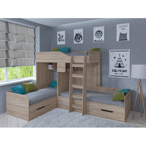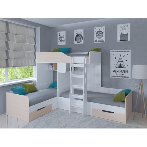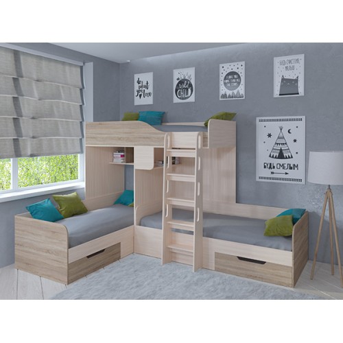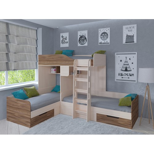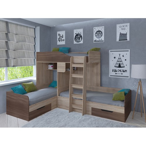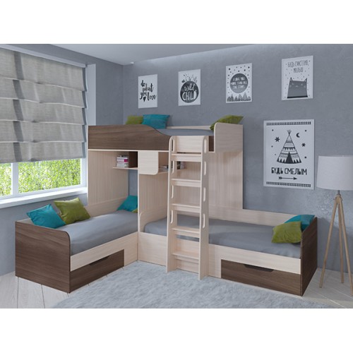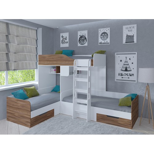 С комплектом "Трио" вопрос о размещении детей исчезнет навсегда. У каждого ребёнка будет своё отдельное спальное место. А остальное пространство комнаты вы сможете использовать для обустройства мест хранения, рабочей и игровой зоны.