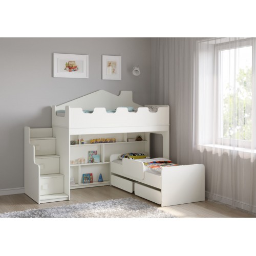 Под верхним ярусом кровати находится большой стеллаж, который предоставляет достаточно места для хранения книг, игрушек и других вещей. Угловая лестница с тремя дверками обеспечивает удобный и безопасный доступ на верхний ярус. На боках кровати имеются световые окна, которые обеспечивают естественное освещение и создают атмосферу уюта.