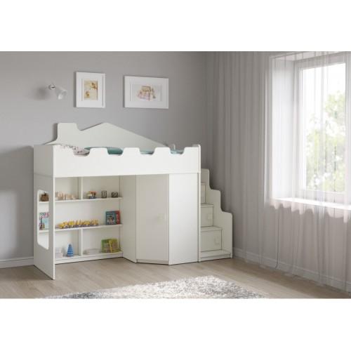 Эта модель кровати станет отличным выбором для вашего малыша. Благодаря угловой лестнице с дверцами и угловому шкафу, ребенок сможет легко и безопасно добраться до своего спального места, а также хранить свои игрушки и вещи в удобном месте.