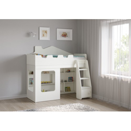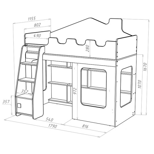 Особенностью этой модели является наличие прямой лестницы с дверцей, которая не только придает кровати-домику особый шарм, но и обеспечивает легкий и безопасный доступ к спальному месту. Стеллаж, расположенный внизу спального места, предоставляет дополнительные возможности для хранения вещей и игрушек.