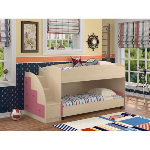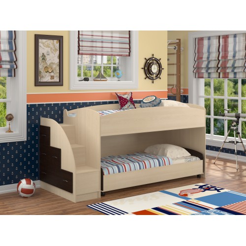 Кровать, рассчитанная на двоих детей, включает в себя два полноценных спальных места и лестницу с боковыми выдвижными ящиками.