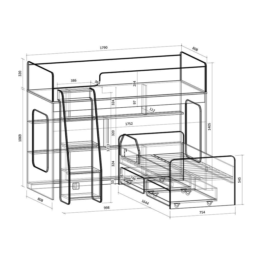 Высота кровати – всего 1405 мм. Удобно - взрослый может заправить кровать, не забираясь на второй ярус.