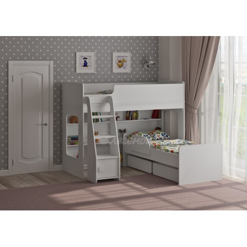 Под верхним спальным местом располагается стеллаж, отлично подходящий для хранения игрушек.