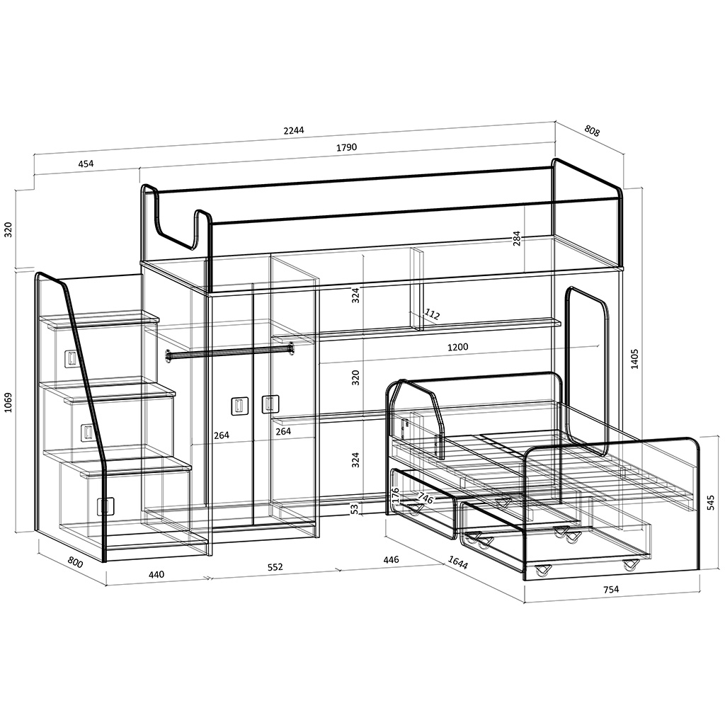 Двухъярусная кровать двумя перпендикулярными спальными местами - 1750*750 и 1600*700 мм.