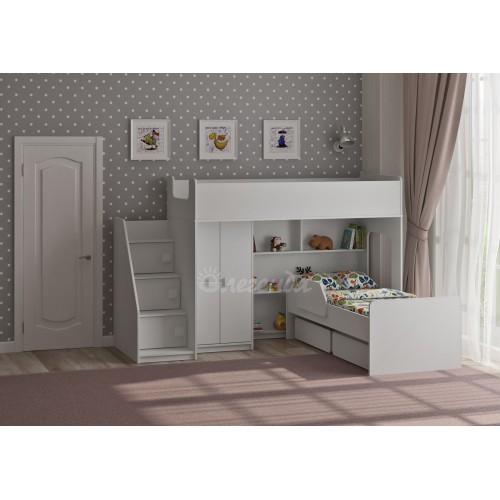 Под верхним спальным местом располагается стеллаж, отлично подходящий для хранения игрушек.