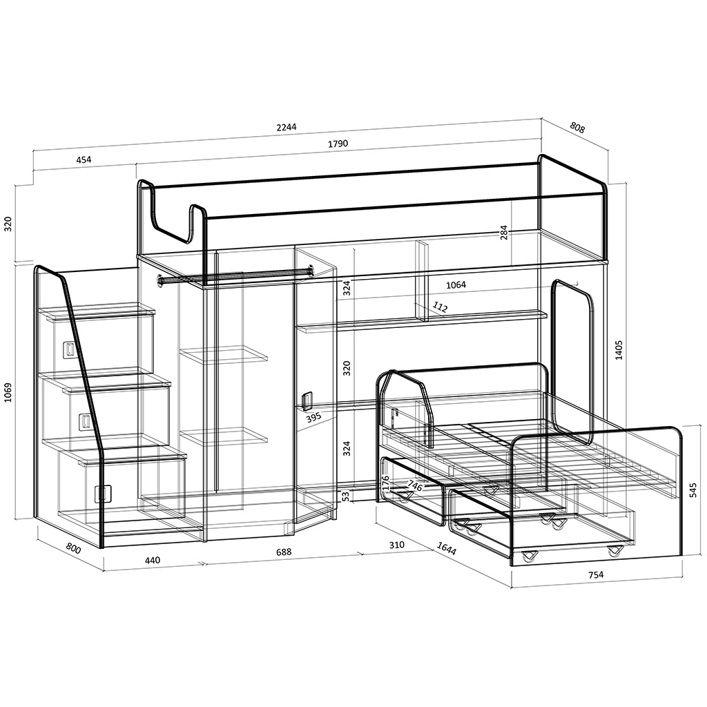 Размеры кроватки: 2245*1762*1405 мм.