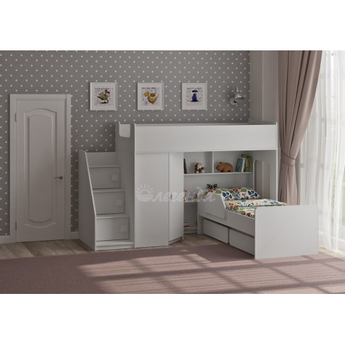 Под верхним спальным местом располагается стеллаж, отлично подходящий для хранения игрушек.
