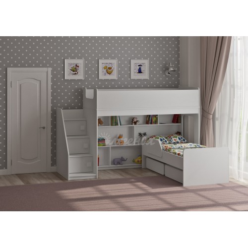 Под верхним спальным местом располагается стеллаж,отлично подходящий для хранения игрушек.