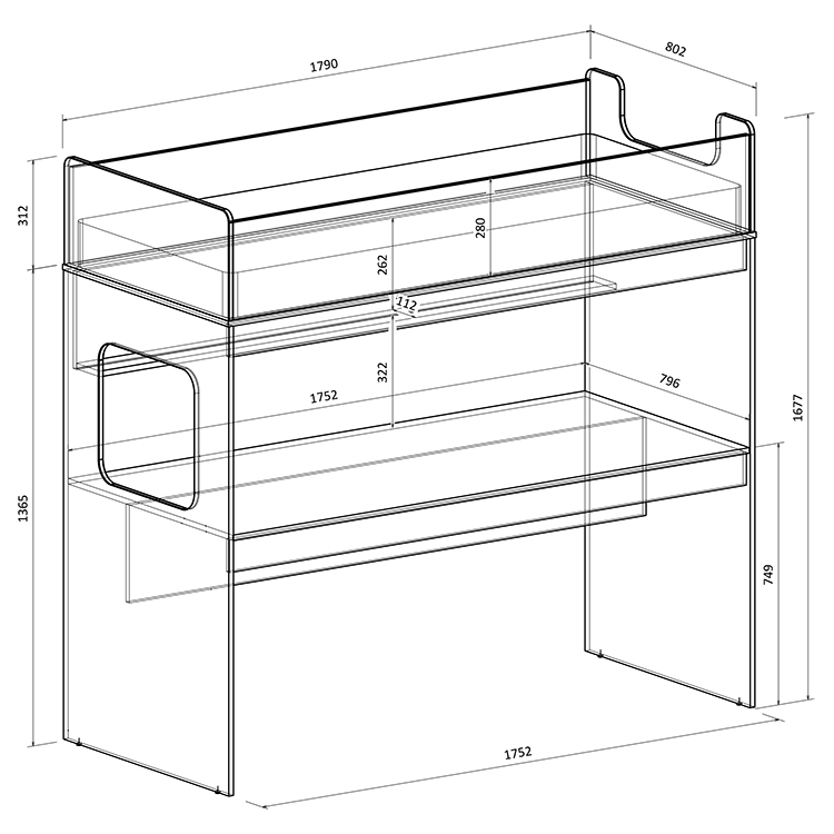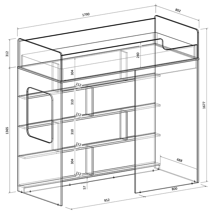 Размер кроватки в соответствии со спальным местом: 1790×3031×1677 (спальное место 1750*750 мм), 1942×3183×1677 (1900*750 мм), 1790× 3081×1677 (1750*800 мм), 1790×3233×1677 (1750*850 мм), 1942×3081×1677 (1900*800 мм), 1942×3233×1677 (1900*850 мм).