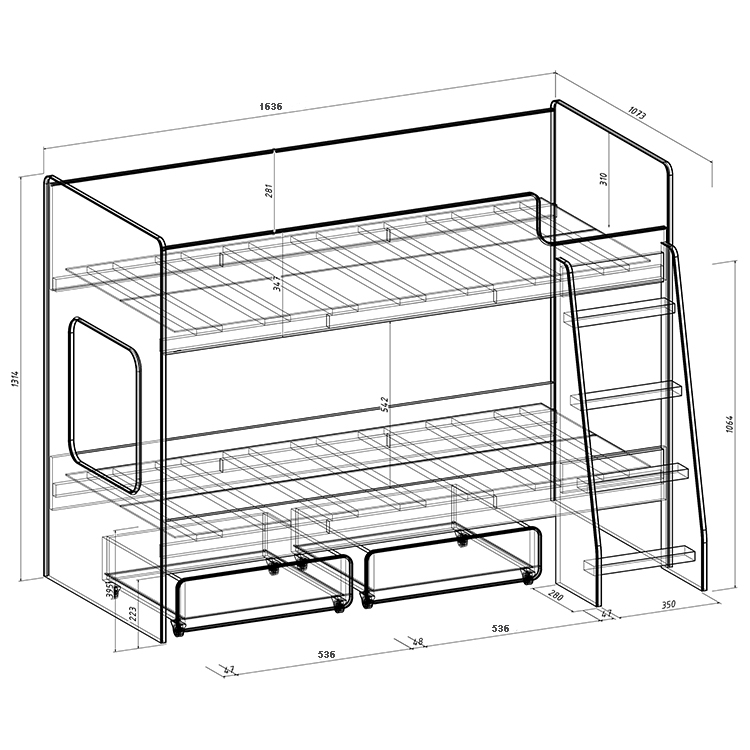 Размеры кроватки в соответствии со спальными местами: 1786*1073*1314 мм (спальное место 1600*750 мм) или 1786*1073*1314 мм (спальное место 1750*750 мм)