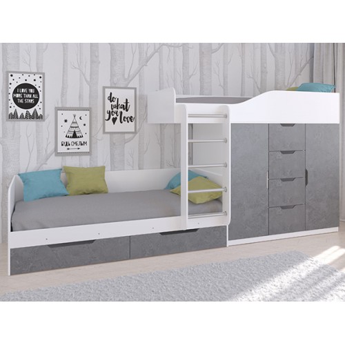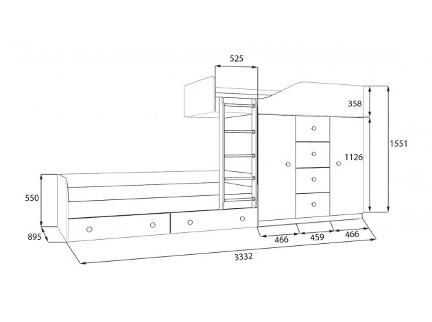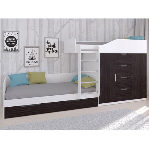 Изделие производится из ЛДСП толщиной 16 мм. Края обработаны кромкой ПВХ 0,4 и 2 мм. Перекладины у лестницы — металл.