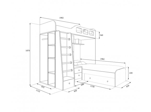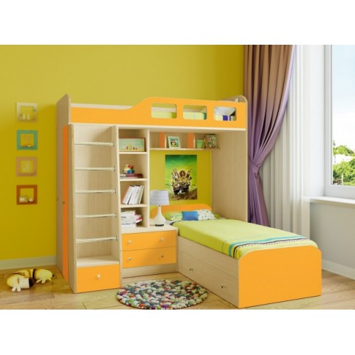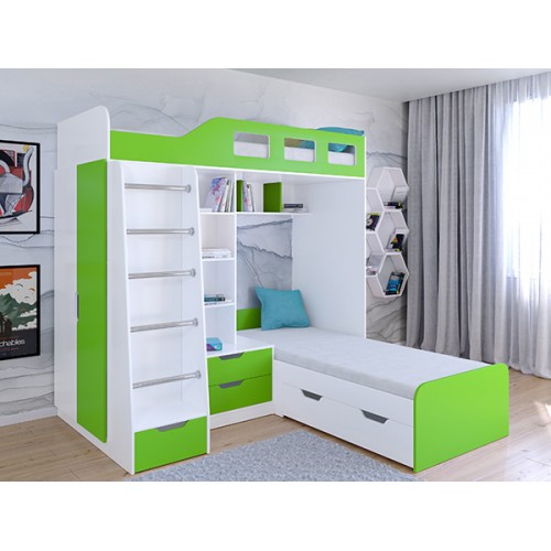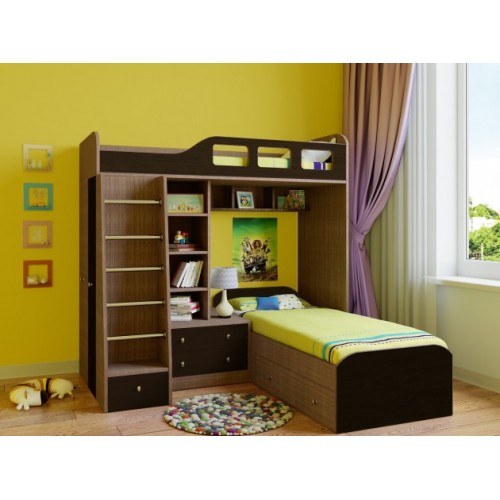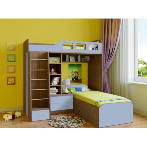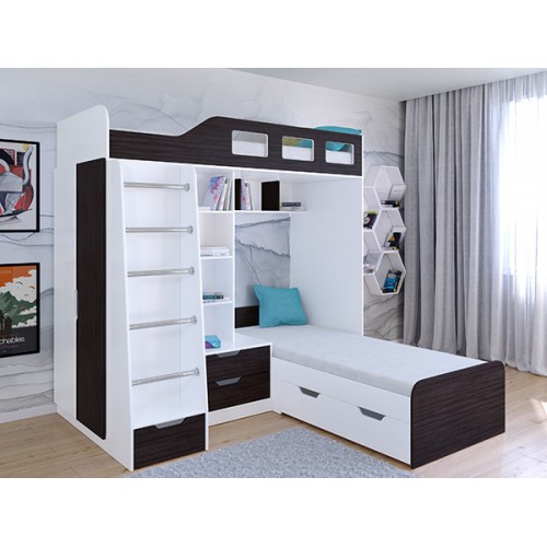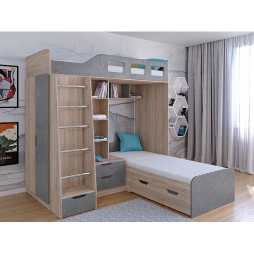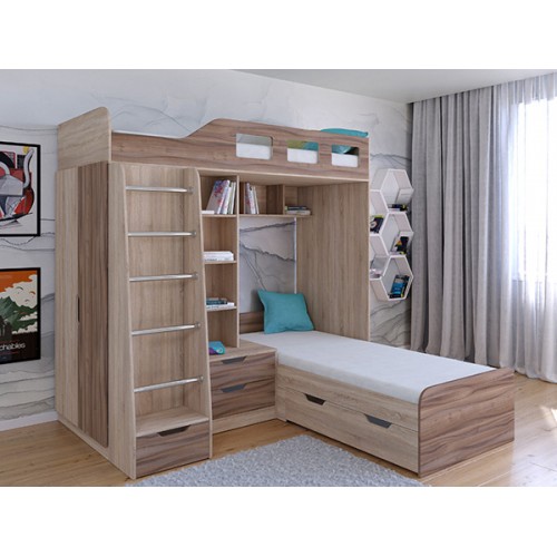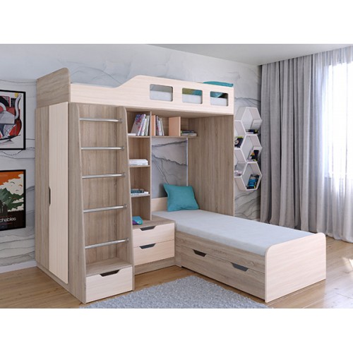 Комплекс сочетает в себе две кровати, под нижней располагается выдвижной ящик для постельных принадлежностей. Под верхним ярусом есть полки, стеллажная секция и комод с двумя ящиками. С торца модуля расположен вместительный шкаф для одежды со штангой и полками.