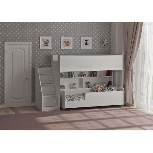 Под верхним спальным местом располагается стеллаж, отлично подходящий для хранения игрушек.
