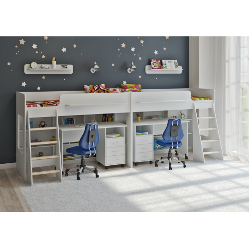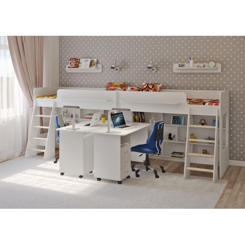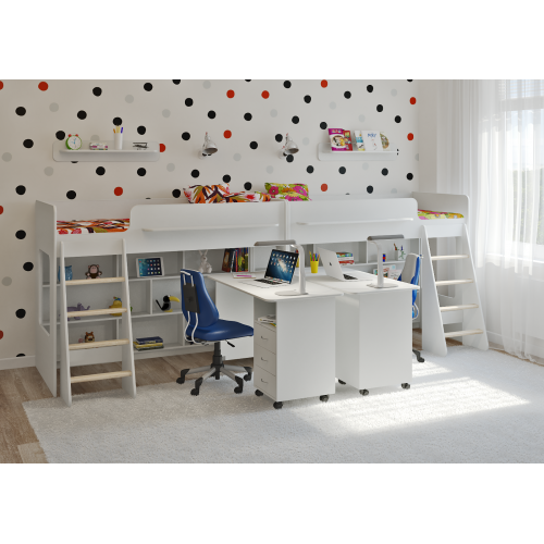 В комплект входят два письменных стола Л-03, оборудованных поворотными колесами. Столы легко перемещаются по полу, задвигаются и выдвигаются. Три выкатных ящика стола обеспечат удобное хранение канцелярии, письменных, учебных и прочих принадлежностей. Над ящиками - открытая полка для мелочей, которые будут всегда под рукой.